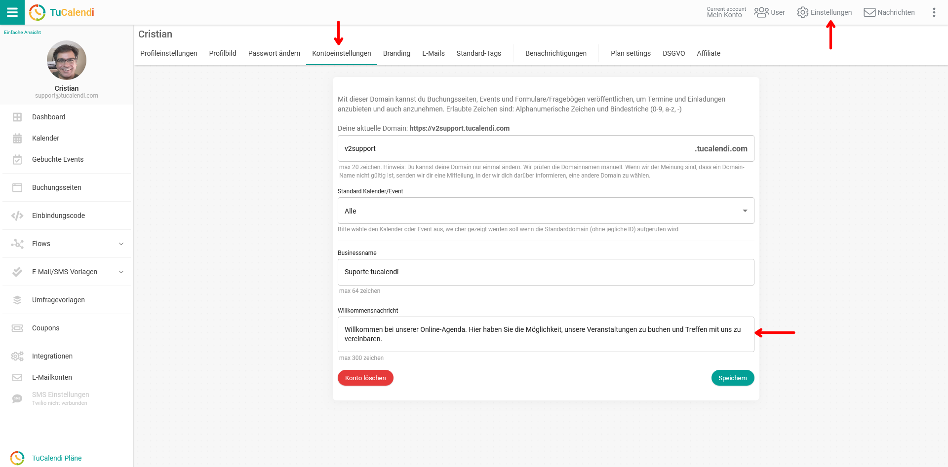 Auf TuCalendi ist die Möglichkeit einer personalisierten Willkommensnachricht sehr einfach darzustellen. Melde dich bei TuCalendi an und rufe deine Kontoeinstellungen auf.