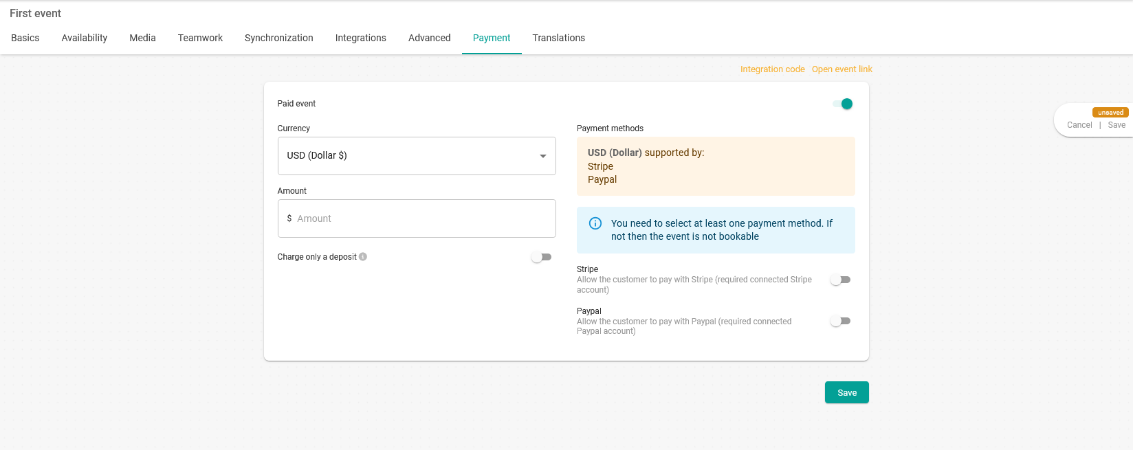 Activate the option "Paid event" and in the options that are enabled simply choose the currency in which you are going to charge, the price you are going to charge per event and your preferred payment gateway .
