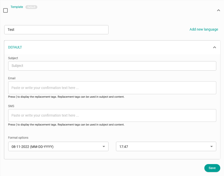 If you have not yet created a confirmation template, click on the "New" button and indicate the name you want the template you are about to create to have.