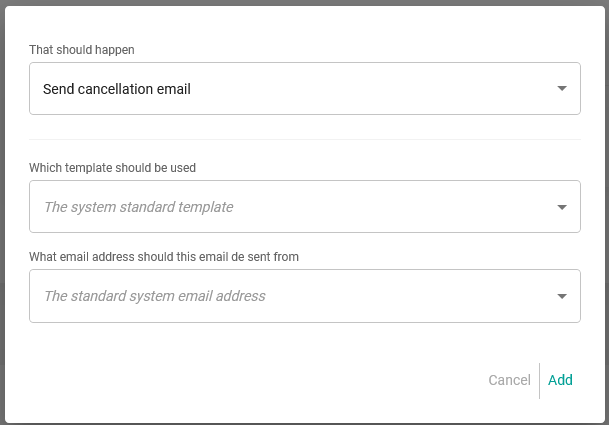 Choose the cancellation template you want to send, the email account from where the cancellation email will be sent and click "Add":