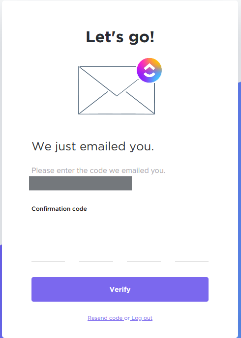 Introduce el código de confirmación que te ha llegado al correo electrónico para que ClickUp pueda comprobar que es correcto.