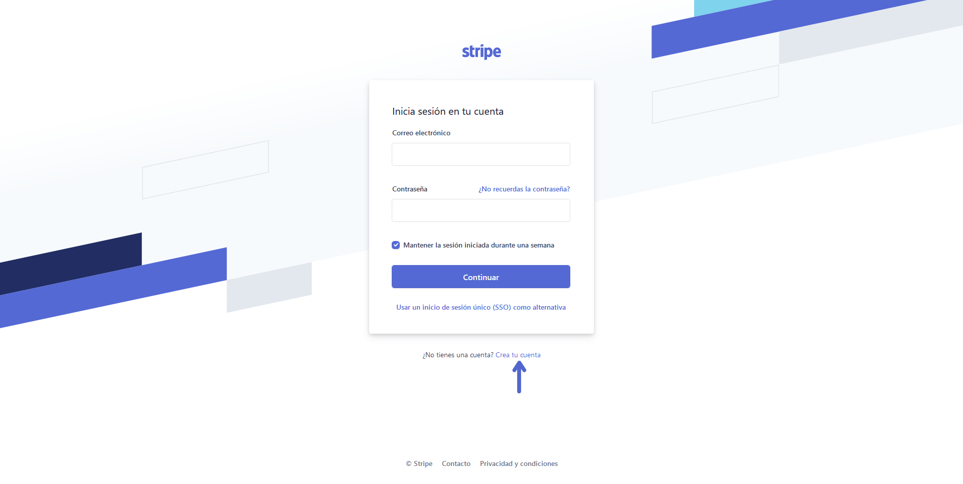 Paso 2: Entrarás a la página de inicio de sesión. Si aún no tiene tu propia cuenta Stripe debes hacer clic en "Crea tu cuenta".