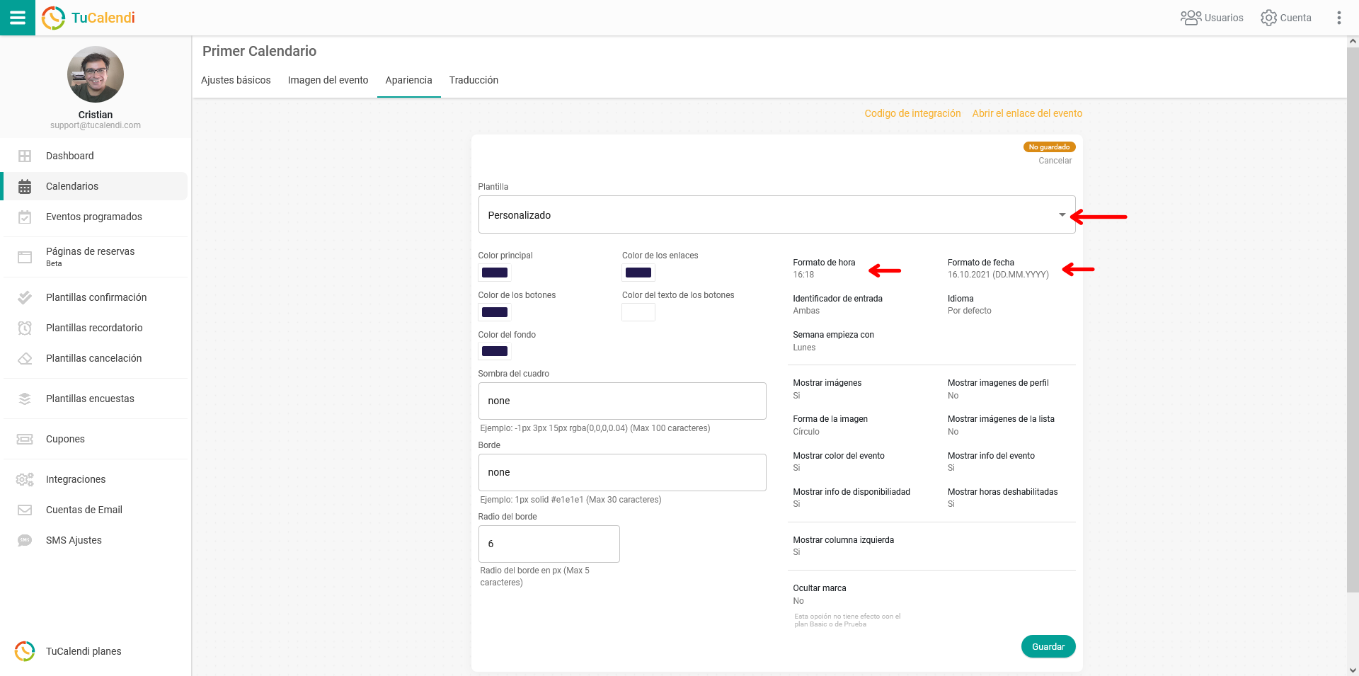 Otra característica que puedes personalizar en el widget de TuCalendi es el formato de fecha y hora, para puedas establecer el más apropiado en cada caso.